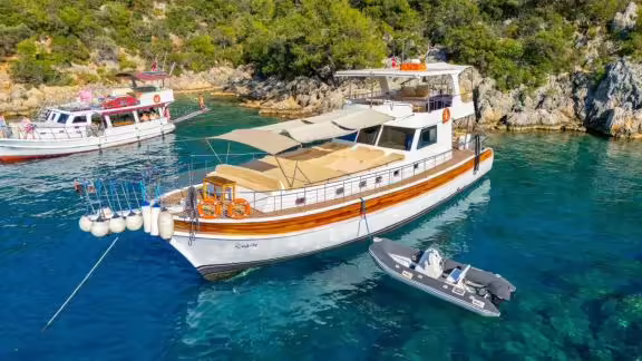 Das Gulet ÇağAy wurde 2023 gebaut und liegt an in Fethiye (Türkei). Selbstverständlich ist auf Anfrage die Yacht auch in anderen Städten für Sie verfügbar. Die Yacht besitzt eine Länge von 22 m, eine Breite von 6.7 m und besitzt einen Tiefgang von 2 m. ÇağAy ist mit seinen 4 Kabinen für bis zu 8 Personen ausgelegt und für diverse Tagesausflüge geeignet. Es gibt insgesamt 4 Badezimmer für Sie und Ihre Gäste. Die Yacht besitzt einen Motor mit einer Leistung von 400 PS (294 kW). Die Fahrgeschwindigkeit des Schiffes beträgt 8 Knoten (15 km/h). Während Ihres Aufenthaltes auf dieser Yacht wird Sie eine erfahrene Crew begleiten, die bereit ist, alle Ihre Wünsche zu erfüllen.