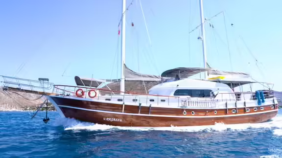 Das Gulet Paşalı wurde 2021 gebaut und liegt an in Marmaris (Türkei). Selbstverständlich ist auf Anfrage die Yacht auch in anderen Städten für Sie verfügbar. Die Yacht besitzt eine Länge von 24 m, eine Breite von 6.5 m und besitzt einen Tiefgang von 2.7 m. Paşalı ist mit seinen 6 Kabinen für bis zu 12 Personen ausgelegt und für diverse Tagesausflüge geeignet. Es gibt insgesamt 6 Badezimmer für Sie und Ihre Gäste. Die Yacht besitzt 2 Motoren mit jeweils einer Leistung von 400 PS (294 kW). Die Fahrgeschwindigkeit des Schiffes beträgt 10 Knoten (19 km/h). Während Ihres Aufenthaltes auf dieser Yacht wird Sie eine erfahrene Crew begleiten, die bereit ist, alle Ihre Wünsche zu erfüllen.