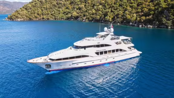 Die Motoryacht Stella Fiera wurde 1998 gebaut und liegt an in Bodrum (Türkei). Selbstverständlich ist auf Anfrage die Yacht auch in anderen Städten für Sie verfügbar. Die Yacht besitzt eine Länge von 35 m, eine Breite von 8 m und besitzt einen Tiefgang von 2.8 m. Stella Fiera ist mit seinen 5 Kabinen für bis zu 10 Personen ausgelegt und für diverse Tagesausflüge geeignet. Es gibt insgesamt 5 Badezimmer für Sie und Ihre Gäste. Die Yacht besitzt 2 Motoren mit jeweils einer Leistung von 3412 PS (2510 kW). Die Fahrgeschwindigkeit des Schiffes beträgt 12 Knoten (22 km/h). Während Ihres Aufenthaltes auf dieser Yacht wird Sie eine erfahrene Crew begleiten, die bereit ist, alle Ihre Wünsche zu erfüllen.
