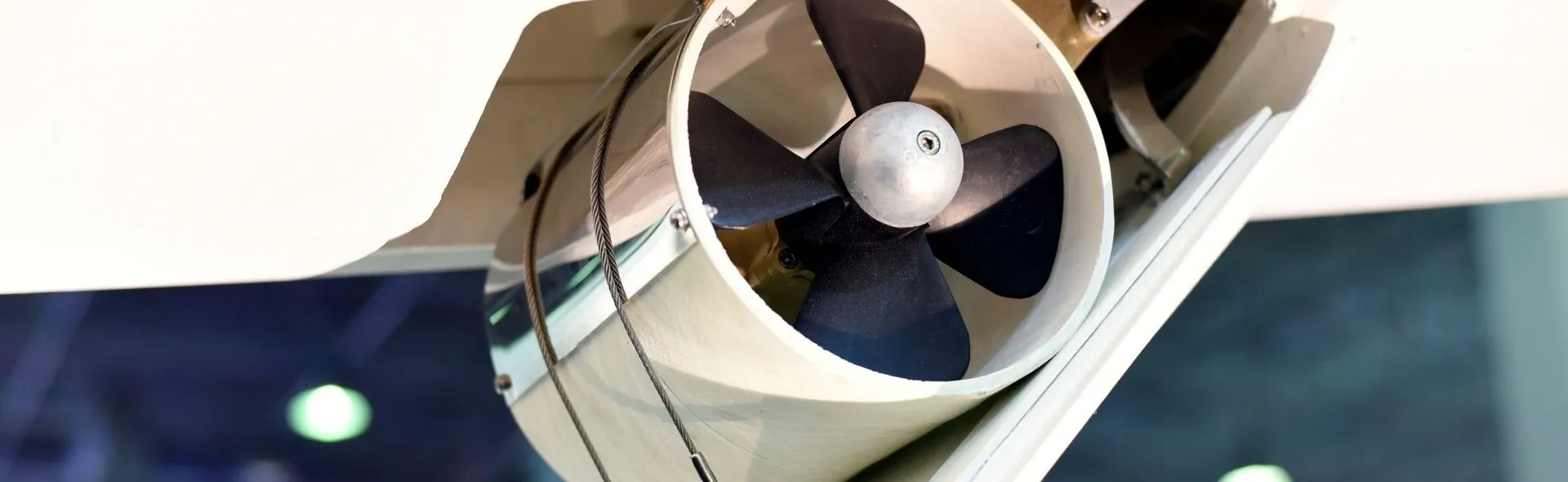 Inside the hull, beneath the waterline, a tunnel runs across the bow. A small propeller sits in this tunnel and pushes water to either side. When the skipper activates the thruster, the bow shifts gently in the opposite direction.