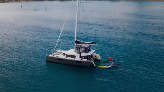 The Catamaran Nomad was built in 2019 and is moored in Lavrion (Greece). Of course, the yacht is also available for you in other cities on request. The yacht has a length of 15.84 m, a beam of 8.6 m and a draught of 1.5 m. Nomad with its 6 cabins is designed for up to 12 people and is suitable for various day trips. There are 6 bathrooms for you and for your guests. The yacht has 2 engines, each with an output of 80 hp (59 kW). The cruising speed of the vessel is 7 knots (13 km/h). During your stay on this yacht, you will be accompanied by an experienced crew ready to meet all your needs.