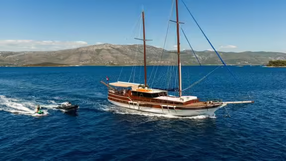 The Gulet Eleganza was built in 1997 and is moored in Split (Croatia). Of course, the yacht is also available for you in other cities on request. The yacht has a length of 27 m, a beam of 6.7 m and a draught of 2.8 m. Eleganza with its 5 cabins is designed for up to 10 people and is suitable for various day trips. There are 5 bathrooms for you and for your guests. The yacht has an engine with an output of 450 hp (331 kW). The cruising speed of the vessel is 8 knots (15 km/h). During your stay on this yacht, you will be accompanied by an experienced crew ready to meet all your needs.